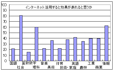 (7)次の教科の中で、インターネット活用すると効果が表れると思うものに○を付けてください。(複数選択可) @( )国語 A( )社会 B( )算数/数学 C( )理科 D( )音楽 E( )図画工作/美術F( )保健体育 G( )技術・家庭 H( )英語 I( )農林水産系 J( )工業系 K( )商業系 L( )教科「情報」 | |