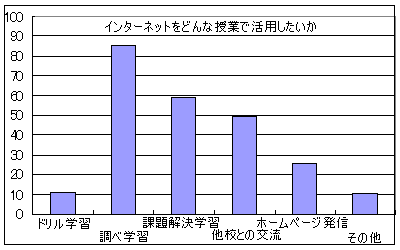 (8)授業でインターネットを活用する際、どんな授業で活用したいと思っていますか。(複数選択可) @( )ドリル学習 A( )調べ学習 B( )課題解決学習 C( )他校との交流 D( )ホームページ発信 E( )その他 | |