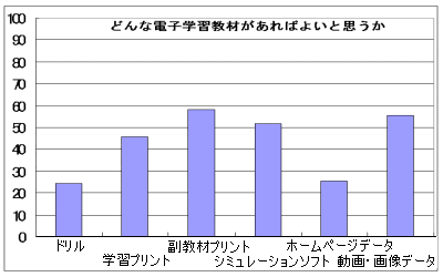 (9)あなたは、どんな電子学習教材があればよいと思いますか。(複数選択可) @( )ドリル(漢字や計算プリント) A( )授業で活用できる学習プリント B( )副教材プリント(参考資料集) C( )シミュレーションソフト D( )ホームページデータ E( )動画・画像データ | |